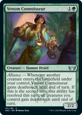 | Card Text | Alliance — Whenever another creature enters the battlefield under your control, Venom Connoisseur gains deathtouch until end of turn. If this is the second time this ability has resolved this turn, all creatures you control gain deathtouch until end of turn. |
